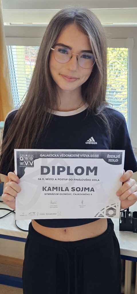 Ve středu 22. října se osm studentů z třídy 2.D zúčastnilo školního kola celostátní soutěže Galaktická vědomostní výzva 2025. Test obsahoval velmi náročné jak teoretické, tak početní úlohy z oblasti astronomie, jaderné fyziky, elektrotechniky a fyzikální chemie. Nejlepšího výsledku dosáhla na naší škole Kamila Sojma, která se v soutěži v rámci celé České republiky umístila na pěkném 9. místě. Současně postupuje do finálového kola, které se uskutečni v pátek 5. prosince v Olomouci v Pevnosti poznání. Gratulujeme.